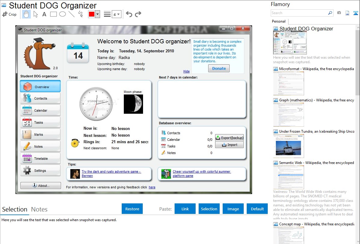 Flamory helps you capture and store screenshots from Student DOG Organizer by pressing a single hotkey. It will be saved to a history, so you can continue doing your tasks without interruptions. Later, you can edit the screenshot: crop, resize, add labels and highlights. After that, you can paste the screenshot into any other document or e-mail message.