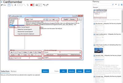 CanRemember is a canned speech manager, which allows you to quickly access stored procedures. This program is designed to add, store, edit and delete text snippets, ready to copy and paste on forums, with BBcode already prepared. CanRemember was originally created by bibi26. After having stopped the project, he gave me the source code and development goes on.