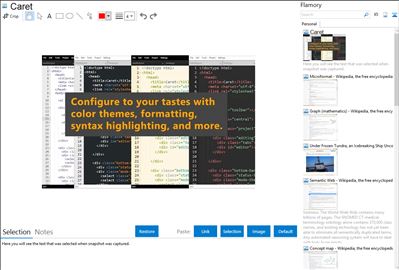 Flamory helps you capture and store screenshots from Caret by pressing a single hotkey. It will be saved to a history, so you can continue doing your tasks without interruptions. Later, you can edit the screenshot: crop, resize, add labels and highlights. After that, you can paste the screenshot into any other document or e-mail message.