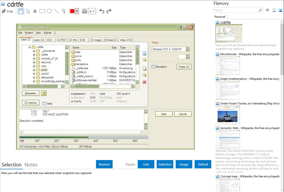 Flamory helps you capture and store screenshots from cdrtfe by pressing a single hotkey. It will be saved to a history, so you can continue doing your tasks without interruptions. Later, you can edit the screenshot: crop, resize, add labels and highlights. After that, you can paste the screenshot into any other document or e-mail message.