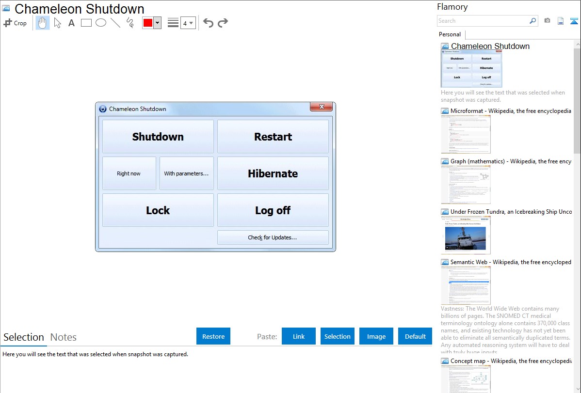Flamory helps you capture and store screenshots from Chameleon Shutdown by pressing a single hotkey. It will be saved to a history, so you can continue doing your tasks without interruptions. Later, you can edit the screenshot: crop, resize, add labels and highlights. After that, you can paste the screenshot into any other document or e-mail message.