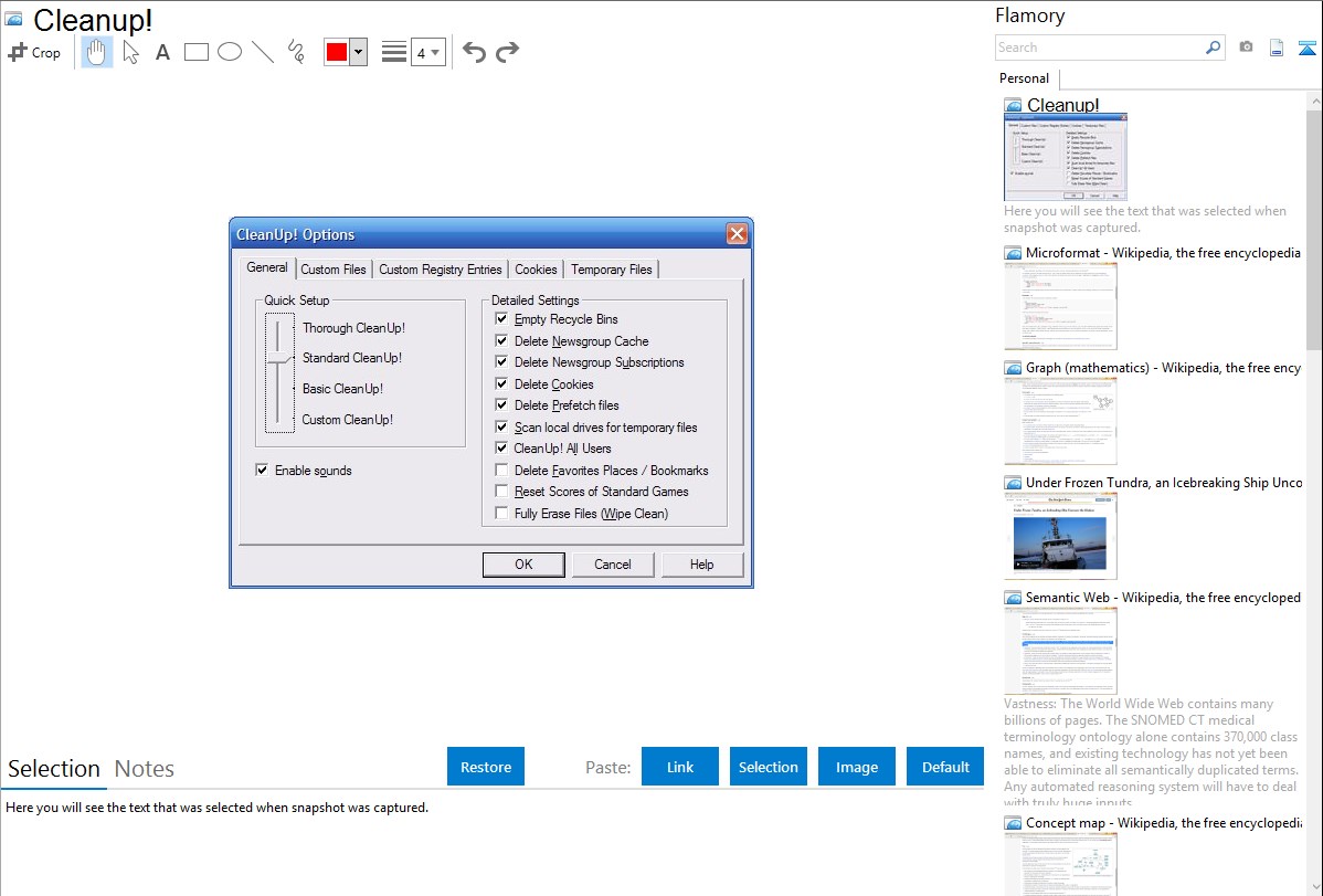 Flamory helps you capture and store screenshots from Cleanup! by pressing a single hotkey. It will be saved to a history, so you can continue doing your tasks without interruptions. Later, you can edit the screenshot: crop, resize, add labels and highlights. After that, you can paste the screenshot into any other document or e-mail message.