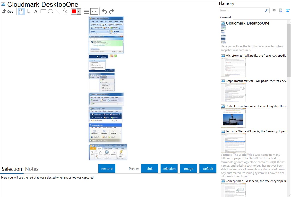Flamory helps you capture and store screenshots from Cloudmark DesktopOne by pressing a single hotkey. It will be saved to a history, so you can continue doing your tasks without interruptions. Later, you can edit the screenshot: crop, resize, add labels and highlights. After that, you can paste the screenshot into any other document or e-mail message.