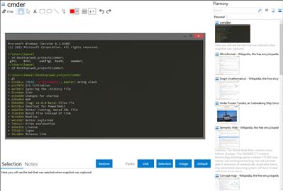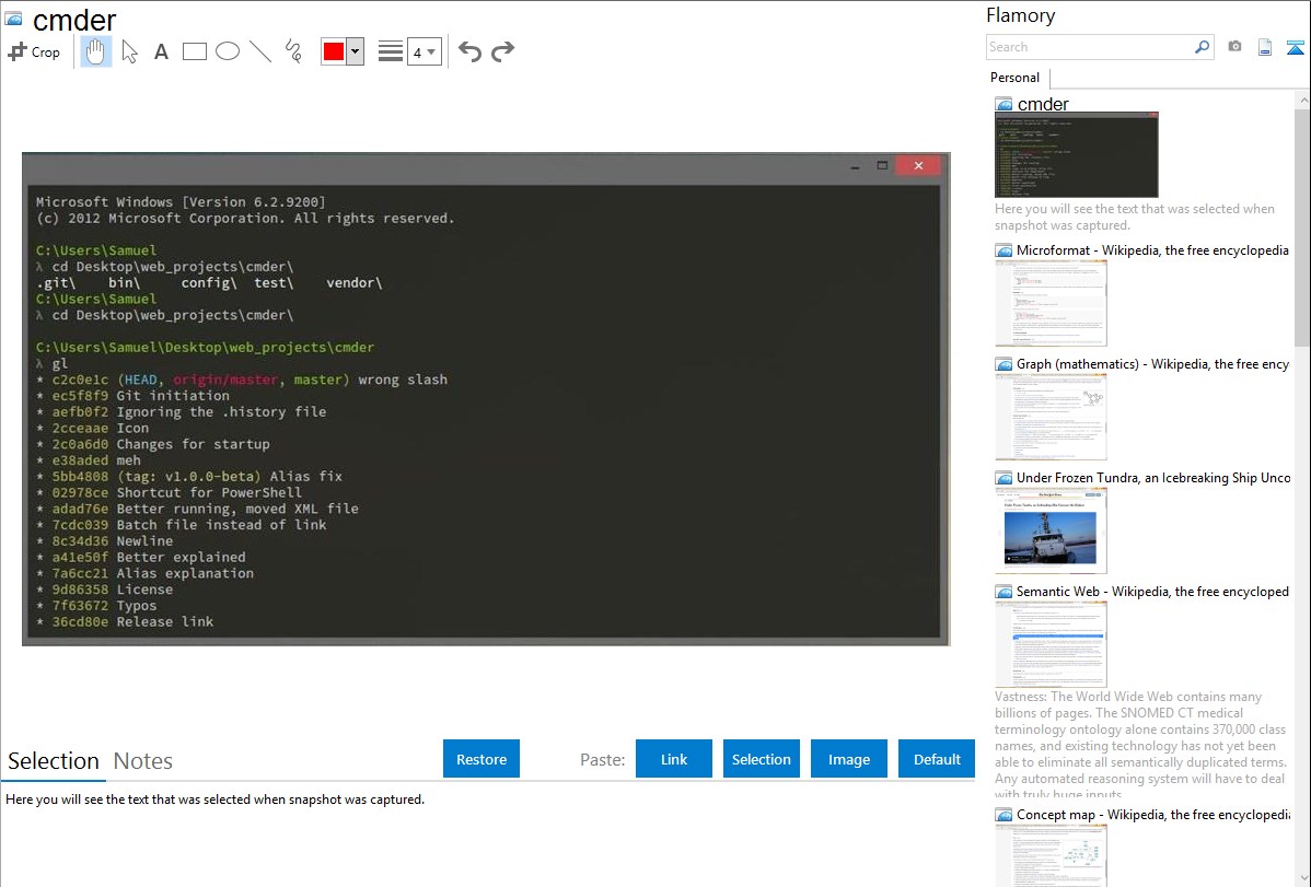 Flamory helps you capture and store screenshots from cmder by pressing a single hotkey. It will be saved to a history, so you can continue doing your tasks without interruptions. Later, you can edit the screenshot: crop, resize, add labels and highlights. After that, you can paste the screenshot into any other document or e-mail message.