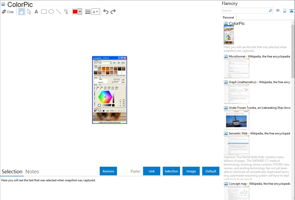 Flamory helps you capture and store screenshots from ColorPic by pressing a single hotkey. It will be saved to a history, so you can continue doing your tasks without interruptions. Later, you can edit the screenshot: crop, resize, add labels and highlights. After that, you can paste the screenshot into any other document or e-mail message.