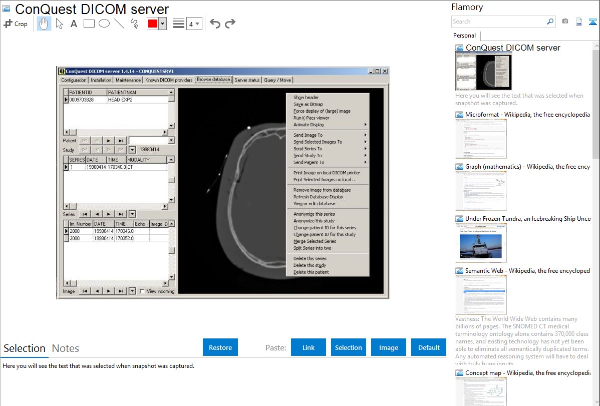 Flamory helps you capture and store screenshots from ConQuest DICOM server by pressing a single hotkey. It will be saved to a history, so you can continue doing your tasks without interruptions. Later, you can edit the screenshot: crop, resize, add labels and highlights. After that, you can paste the screenshot into any other document or e-mail message.