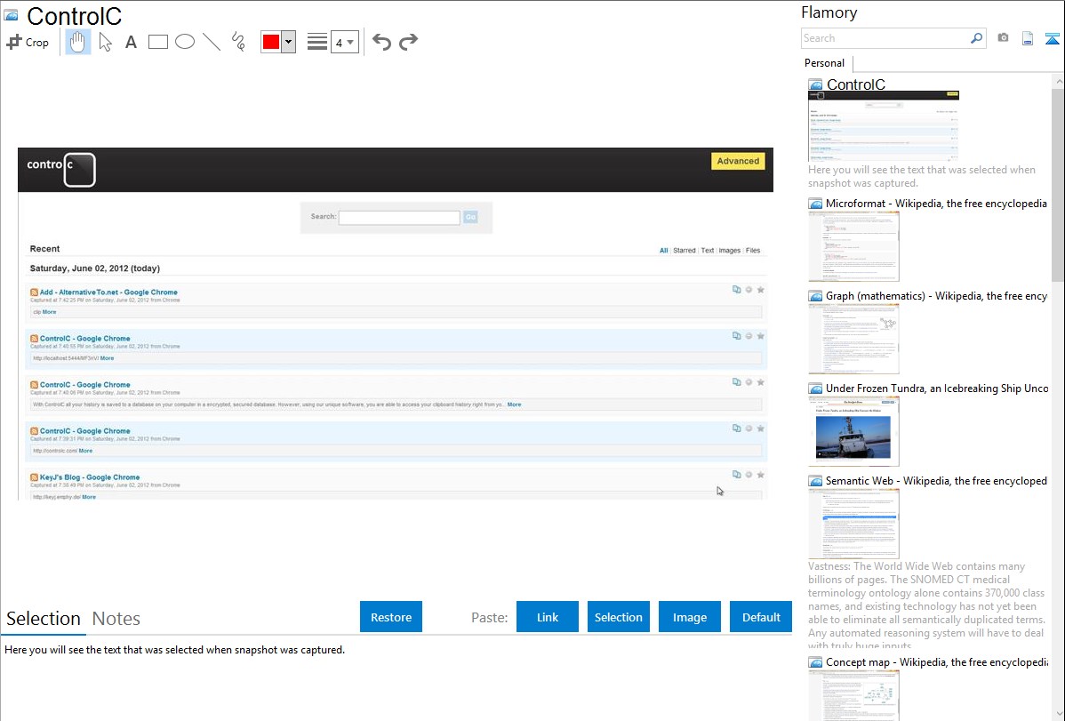Flamory helps you capture and store screenshots from ControlC by pressing a single hotkey. It will be saved to a history, so you can continue doing your tasks without interruptions. Later, you can edit the screenshot: crop, resize, add labels and highlights. After that, you can paste the screenshot into any other document or e-mail message.