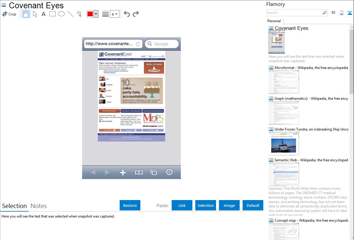 Flamory helps you capture and store screenshots from Covenant Eyes by pressing a single hotkey. It will be saved to a history, so you can continue doing your tasks without interruptions. Later, you can edit the screenshot: crop, resize, add labels and highlights. After that, you can paste the screenshot into any other document or e-mail message.