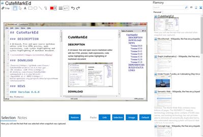 Flamory helps you capture and store screenshots from CuteMarkEd by pressing a single hotkey. It will be saved to a history, so you can continue doing your tasks without interruptions. Later, you can edit the screenshot: crop, resize, add labels and highlights. After that, you can paste the screenshot into any other document or e-mail message.