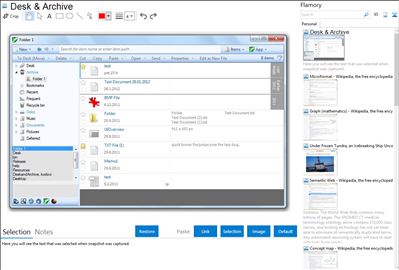 Desk & Archive is a file manager with redefined desktop for a workplace. People usually store on Windows desktop their unfinished documents mixed with frequently used documents and shortcuts to programs and folders. This makes desktop suboptimal in all of those functions. Desk & Archive offers Desk as a way to create and track your unfinished documents, Launch bar for shortcuts to programs, pinned folders to Sidebar instead of shortcut to folders, and templates and bookmarks as tools for frequently used documents.