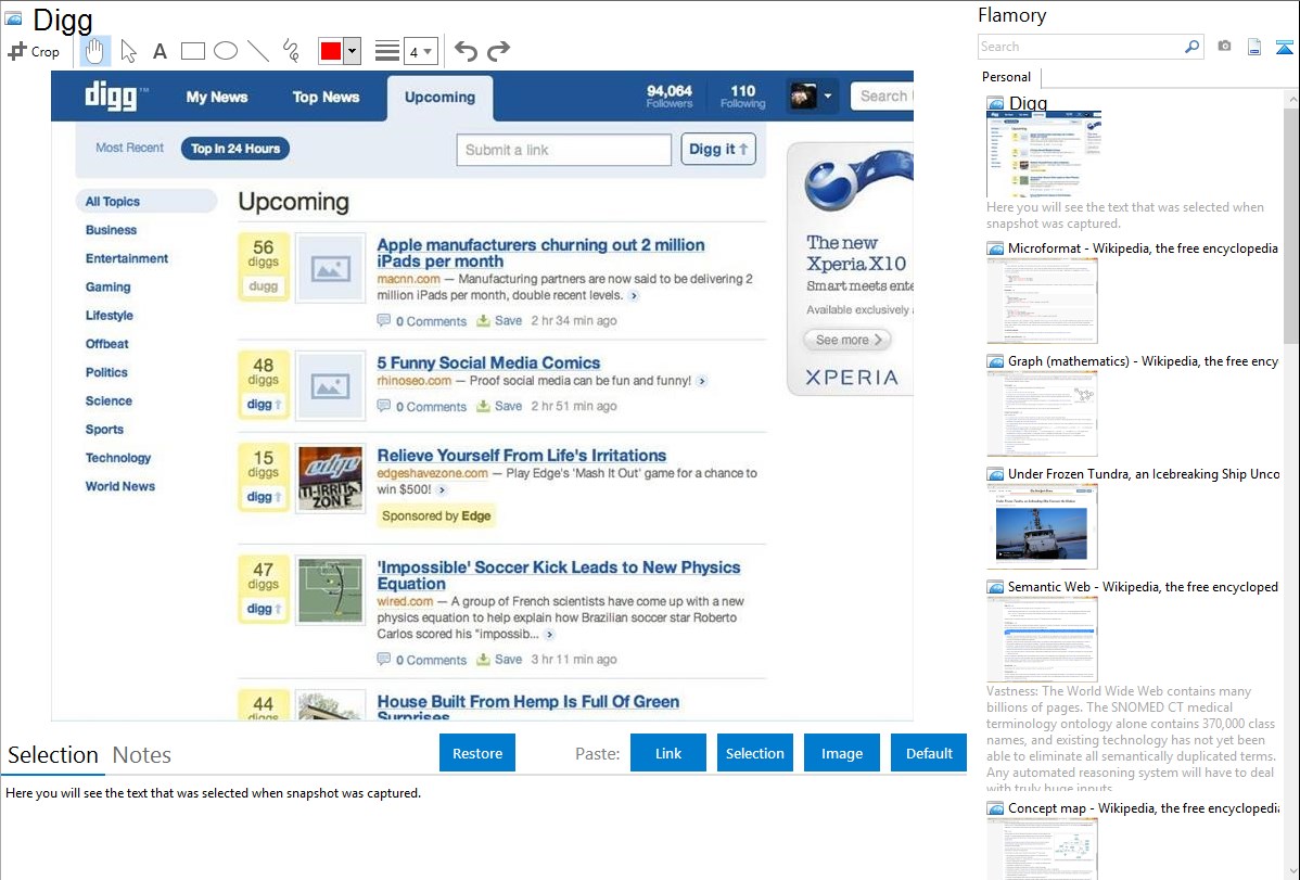 Flamory helps you capture and store screenshots from Digg by pressing a single hotkey. It will be saved to a history, so you can continue doing your tasks without interruptions. Later, you can edit the screenshot: crop, resize, add labels and highlights. After that, you can paste the screenshot into any other document or e-mail message.