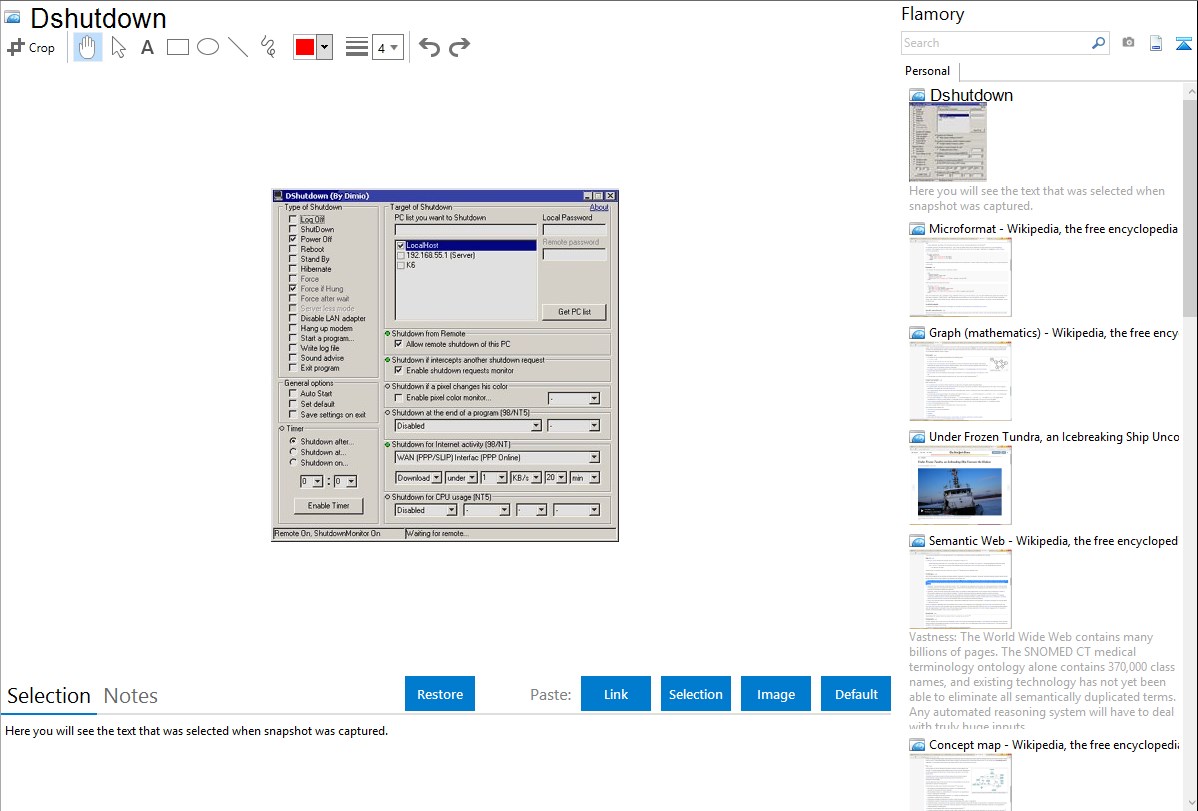 Flamory helps you capture and store screenshots from Dshutdown by pressing a single hotkey. It will be saved to a history, so you can continue doing your tasks without interruptions. Later, you can edit the screenshot: crop, resize, add labels and highlights. After that, you can paste the screenshot into any other document or e-mail message.