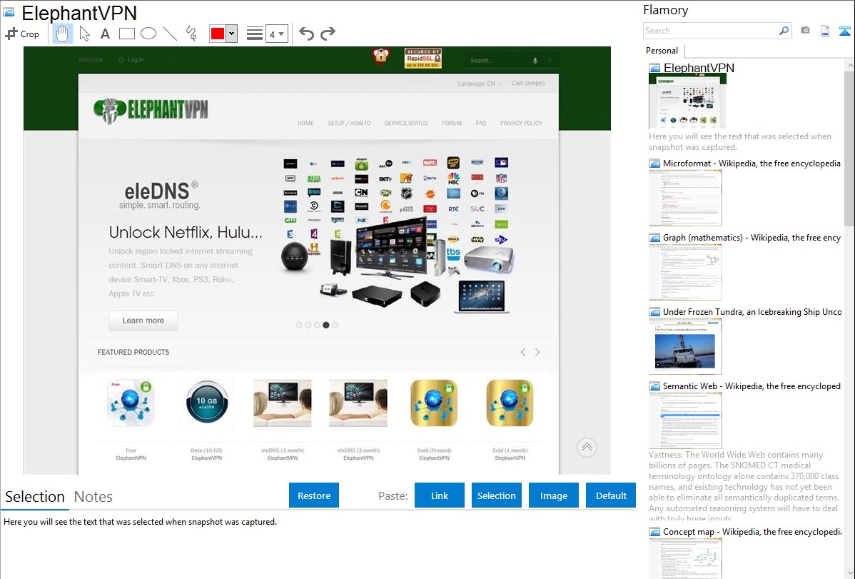 Flamory provides advanced bookmarking for ElephantVPN. It captures screen, selection, text on the page and other context. You can find this bookmark later using search by page content or looking through thumbnail list.