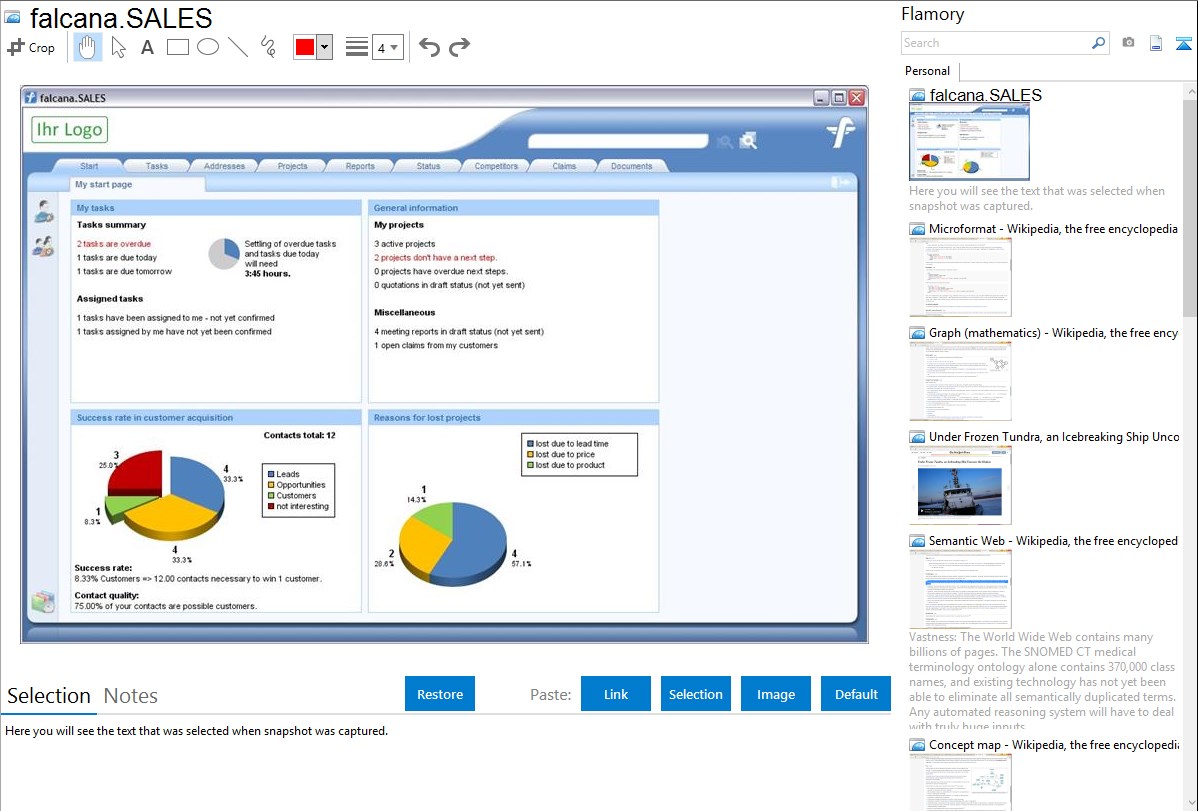 Flamory helps you capture and store screenshots from falcana.SALES by pressing a single hotkey. It will be saved to a history, so you can continue doing your tasks without interruptions. Later, you can edit the screenshot: crop, resize, add labels and highlights. After that, you can paste the screenshot into any other document or e-mail message.