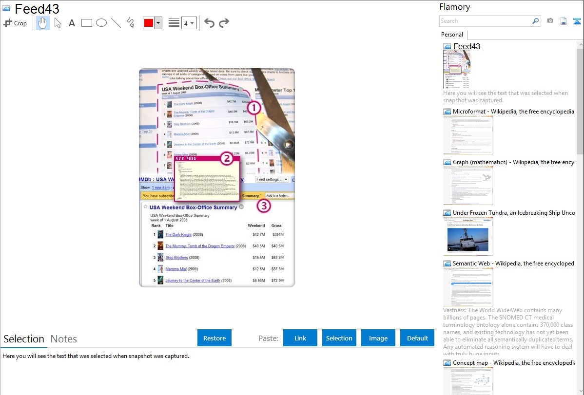 Flamory helps you capture and store screenshots from Feed43 by pressing a single hotkey. It will be saved to a history, so you can continue doing your tasks without interruptions. Later, you can edit the screenshot: crop, resize, add labels and highlights. After that, you can paste the screenshot into any other document or e-mail message.