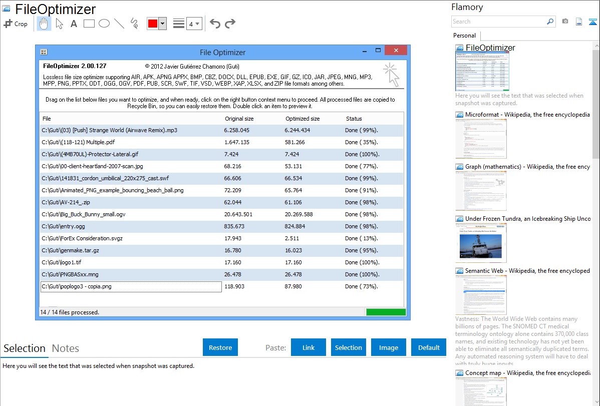 Flamory helps you capture and store screenshots from FileOptimizer by pressing a single hotkey. It will be saved to a history, so you can continue doing your tasks without interruptions. Later, you can edit the screenshot: crop, resize, add labels and highlights. After that, you can paste the screenshot into any other document or e-mail message.