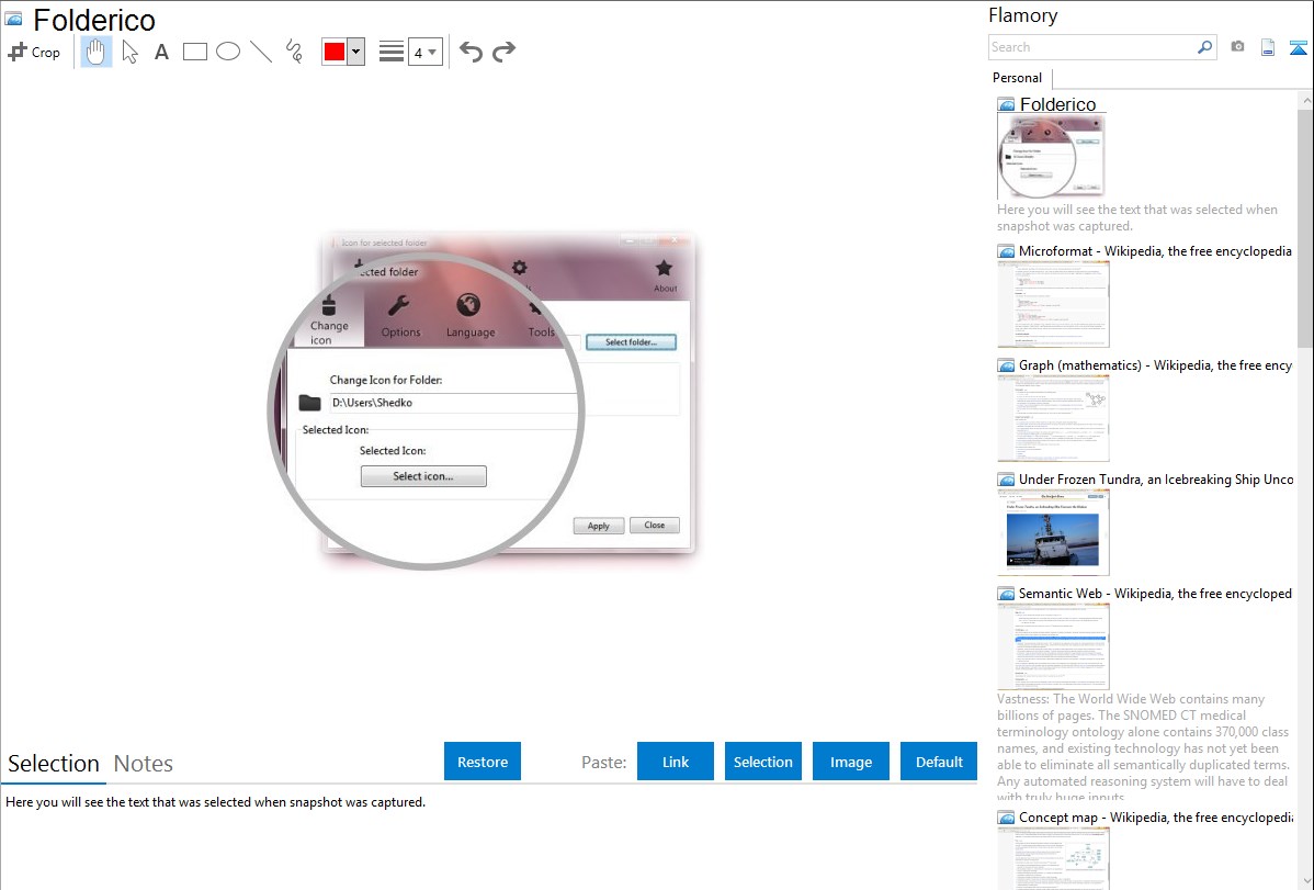 Flamory helps you capture and store screenshots from Folderico by pressing a single hotkey. It will be saved to a history, so you can continue doing your tasks without interruptions. Later, you can edit the screenshot: crop, resize, add labels and highlights. After that, you can paste the screenshot into any other document or e-mail message.