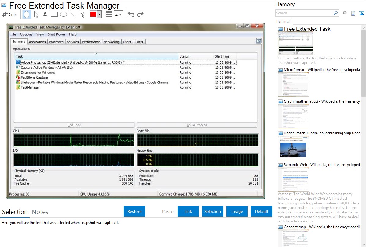 Flamory helps you capture and store screenshots from Free Extended Task Manager by pressing a single hotkey. It will be saved to a history, so you can continue doing your tasks without interruptions. Later, you can edit the screenshot: crop, resize, add labels and highlights. After that, you can paste the screenshot into any other document or e-mail message.