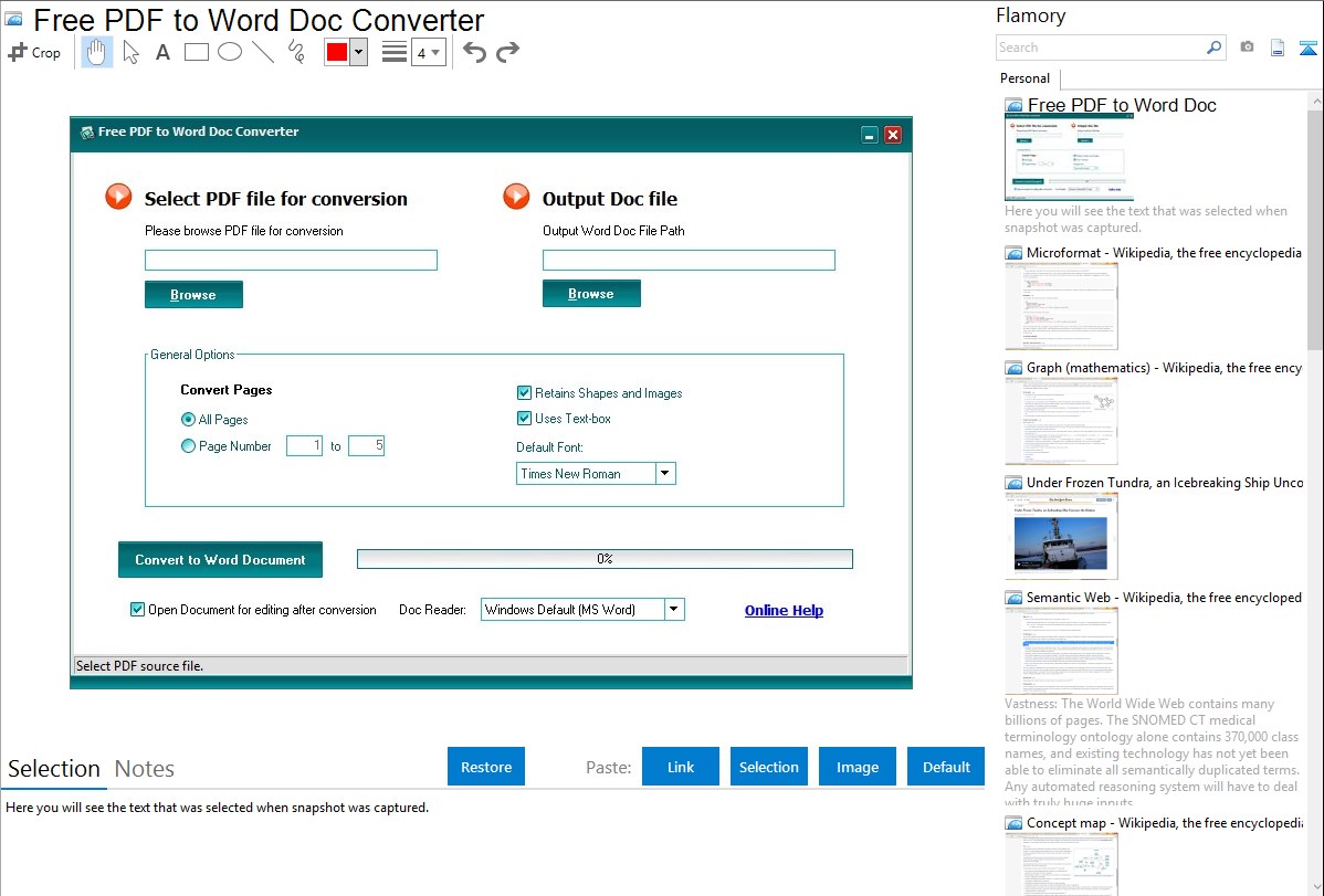 Flamory helps you capture and store screenshots from Free PDF to Word Doc Converter by pressing a single hotkey. It will be saved to a history, so you can continue doing your tasks without interruptions. Later, you can edit the screenshot: crop, resize, add labels and highlights. After that, you can paste the screenshot into any other document or e-mail message.