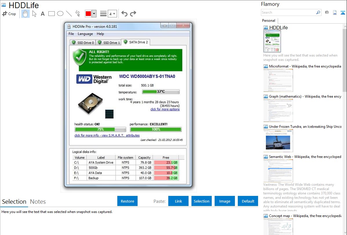 Flamory helps you capture and store screenshots from HDDLife by pressing a single hotkey. It will be saved to a history, so you can continue doing your tasks without interruptions. Later, you can edit the screenshot: crop, resize, add labels and highlights. After that, you can paste the screenshot into any other document or e-mail message.