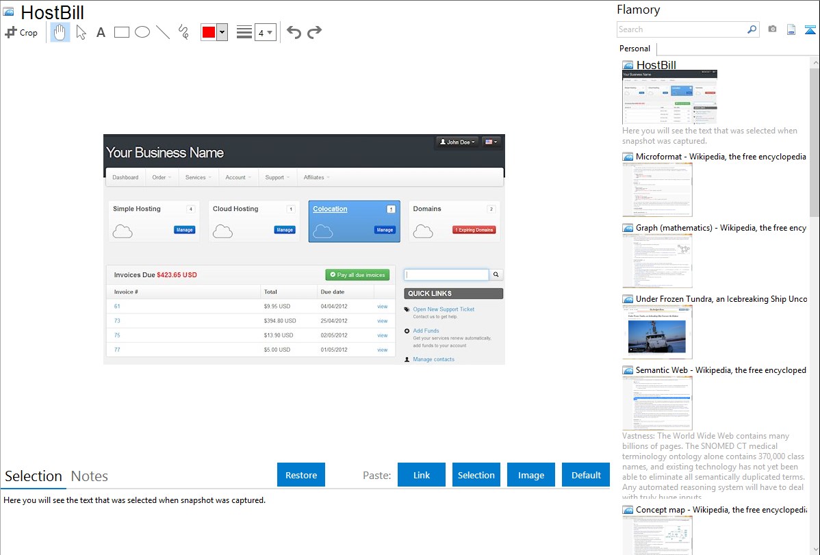 Flamory helps you capture and store screenshots from HostBill by pressing a single hotkey. It will be saved to a history, so you can continue doing your tasks without interruptions. Later, you can edit the screenshot: crop, resize, add labels and highlights. After that, you can paste the screenshot into any other document or e-mail message.