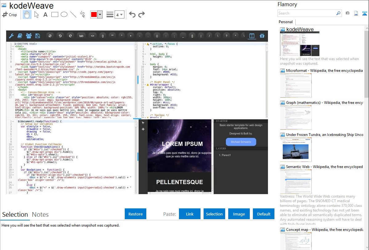 Flamory helps you capture and store screenshots from kodeWeave by pressing a single hotkey. It will be saved to a history, so you can continue doing your tasks without interruptions. Later, you can edit the screenshot: crop, resize, add labels and highlights. After that, you can paste the screenshot into any other document or e-mail message.
