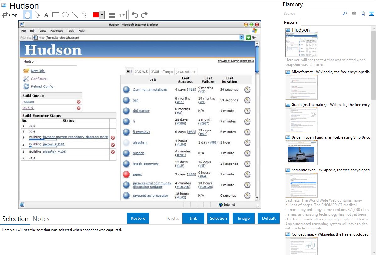 Flamory helps you capture and store screenshots from Hudson by pressing a single hotkey. It will be saved to a history, so you can continue doing your tasks without interruptions. Later, you can edit the screenshot: crop, resize, add labels and highlights. After that, you can paste the screenshot into any other document or e-mail message.