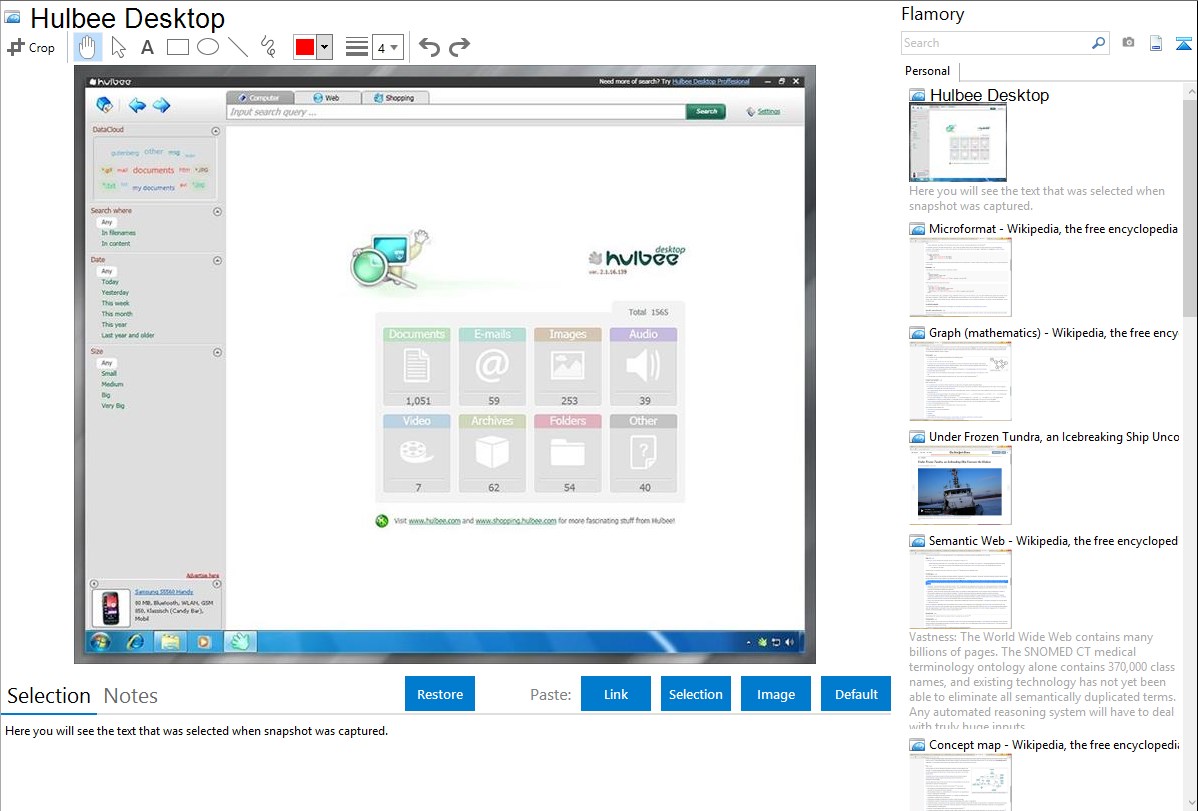 Flamory helps you capture and store screenshots from Hulbee Desktop by pressing a single hotkey. It will be saved to a history, so you can continue doing your tasks without interruptions. Later, you can edit the screenshot: crop, resize, add labels and highlights. After that, you can paste the screenshot into any other document or e-mail message.