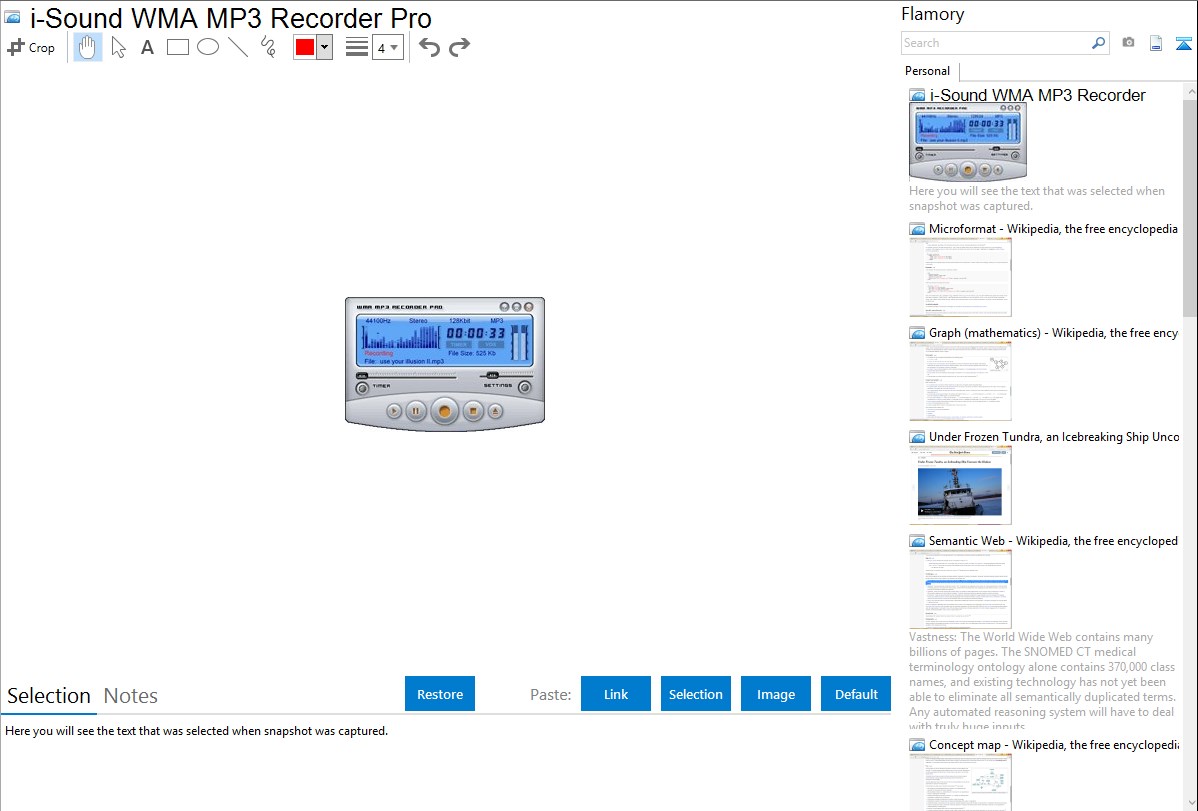 Flamory helps you capture and store screenshots from i-Sound WMA MP3 Recorder Pro by pressing a single hotkey. It will be saved to a history, so you can continue doing your tasks without interruptions. Later, you can edit the screenshot: crop, resize, add labels and highlights. After that, you can paste the screenshot into any other document or e-mail message.