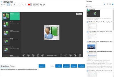 Flamory helps you capture and store screenshots from icoworks by pressing a single hotkey. It will be saved to a history, so you can continue doing your tasks without interruptions. Later, you can edit the screenshot: crop, resize, add labels and highlights. After that, you can paste the screenshot into any other document or e-mail message.