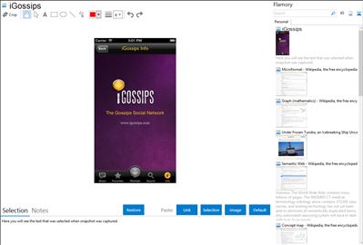 Flamory helps you capture and store screenshots from iGossips by pressing a single hotkey. It will be saved to a history, so you can continue doing your tasks without interruptions. Later, you can edit the screenshot: crop, resize, add labels and highlights. After that, you can paste the screenshot into any other document or e-mail message.