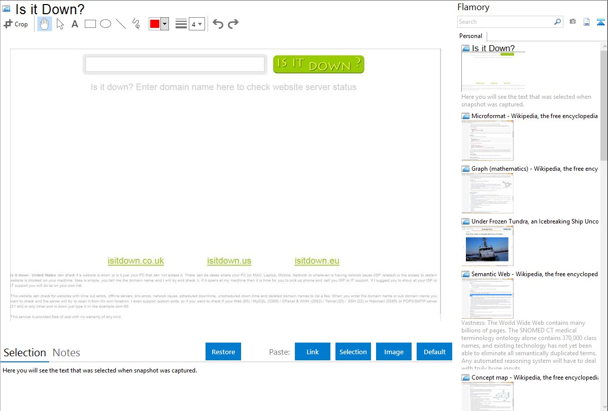 Flamory helps you capture and store screenshots from Is it Down? by pressing a single hotkey. It will be saved to a history, so you can continue doing your tasks without interruptions. Later, you can edit the screenshot: crop, resize, add labels and highlights. After that, you can paste the screenshot into any other document or e-mail message.