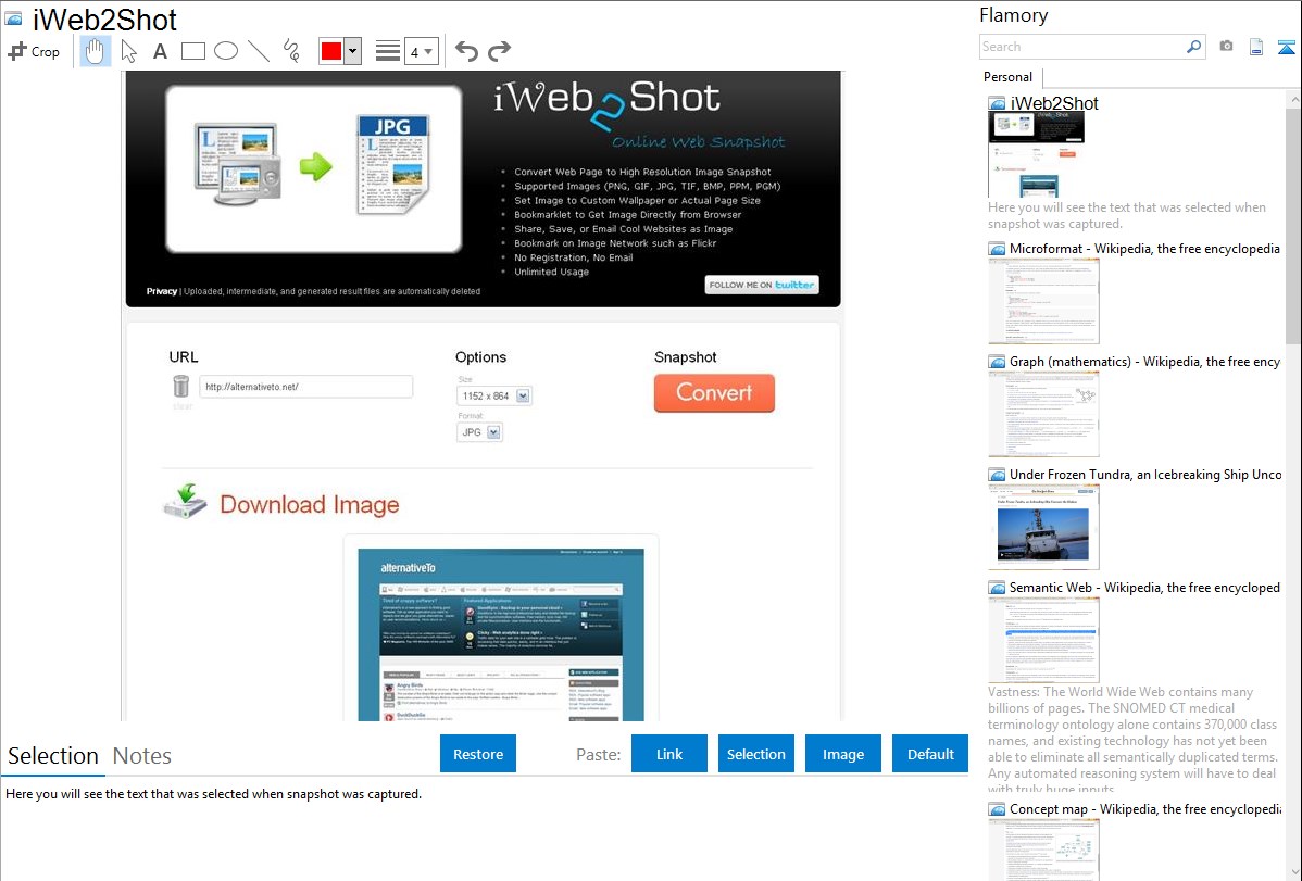 Flamory helps you capture and store screenshots from iWeb2Shot by pressing a single hotkey. It will be saved to a history, so you can continue doing your tasks without interruptions. Later, you can edit the screenshot: crop, resize, add labels and highlights. After that, you can paste the screenshot into any other document or e-mail message.