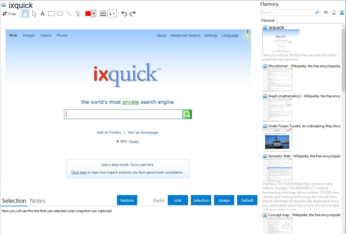 Flamory helps you capture and store screenshots from ixquick by pressing a single hotkey. It will be saved to a history, so you can continue doing your tasks without interruptions. Later, you can edit the screenshot: crop, resize, add labels and highlights. After that, you can paste the screenshot into any other document or e-mail message.