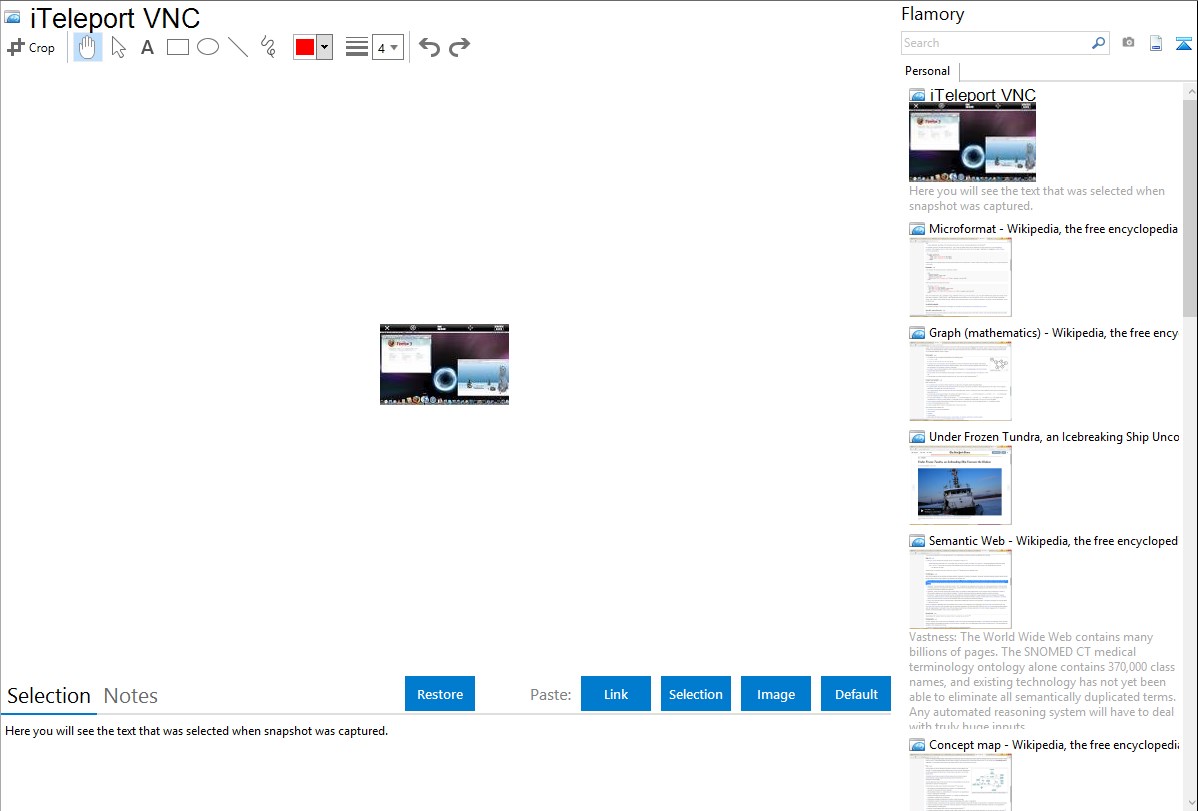 Flamory helps you capture and store screenshots from iTeleport VNC by pressing a single hotkey. It will be saved to a history, so you can continue doing your tasks without interruptions. Later, you can edit the screenshot: crop, resize, add labels and highlights. After that, you can paste the screenshot into any other document or e-mail message.