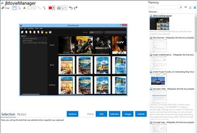 Flamory helps you capture and store screenshots from jMovieManager by pressing a single hotkey. It will be saved to a history, so you can continue doing your tasks without interruptions. Later, you can edit the screenshot: crop, resize, add labels and highlights. After that, you can paste the screenshot into any other document or e-mail message.
