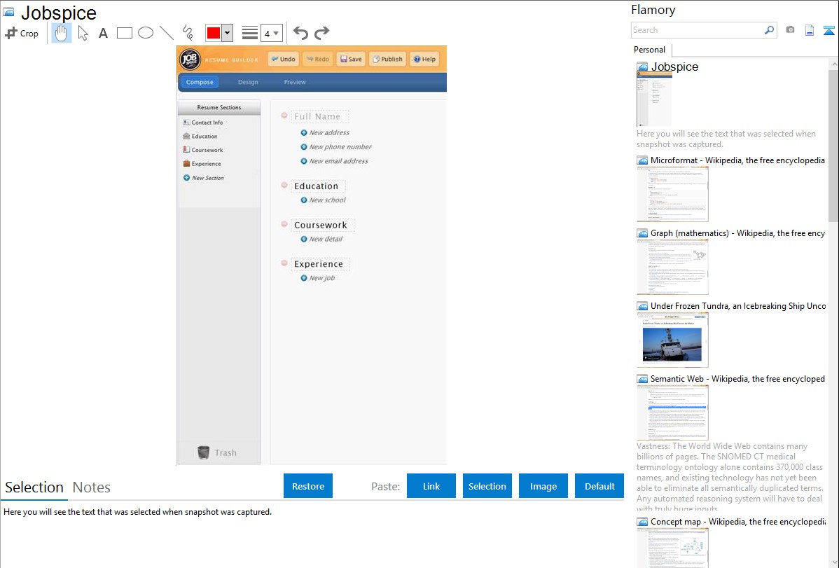 Flamory helps you capture and store screenshots from Jobspice by pressing a single hotkey. It will be saved to a history, so you can continue doing your tasks without interruptions. Later, you can edit the screenshot: crop, resize, add labels and highlights. After that, you can paste the screenshot into any other document or e-mail message.