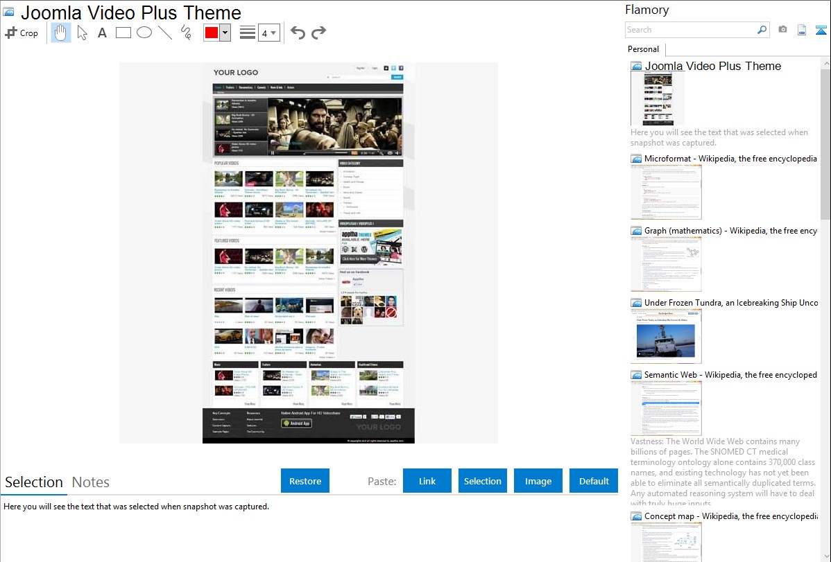 Flamory helps you capture and store screenshots from Joomla Video Plus Theme by pressing a single hotkey. It will be saved to a history, so you can continue doing your tasks without interruptions. Later, you can edit the screenshot: crop, resize, add labels and highlights. After that, you can paste the screenshot into any other document or e-mail message.
