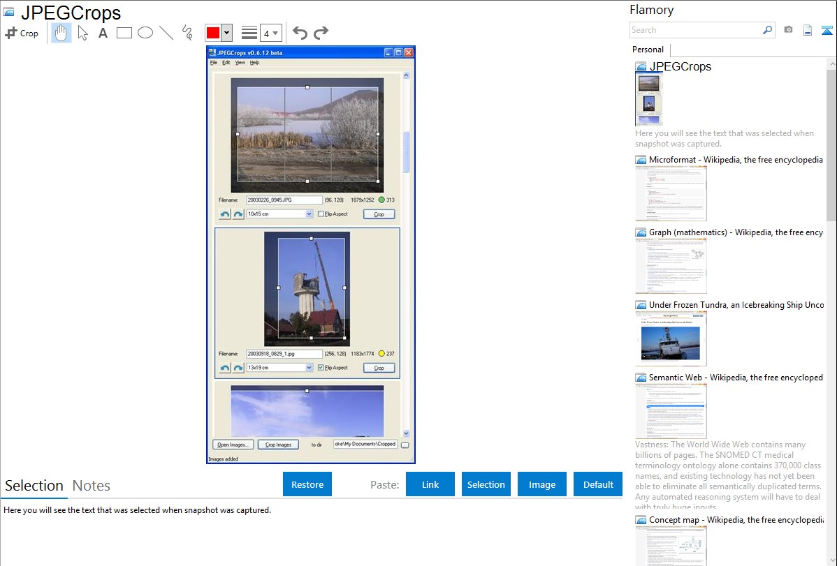 Flamory helps you capture and store screenshots from JPEGCrops by pressing a single hotkey. It will be saved to a history, so you can continue doing your tasks without interruptions. Later, you can edit the screenshot: crop, resize, add labels and highlights. After that, you can paste the screenshot into any other document or e-mail message.