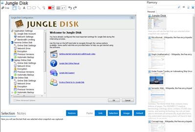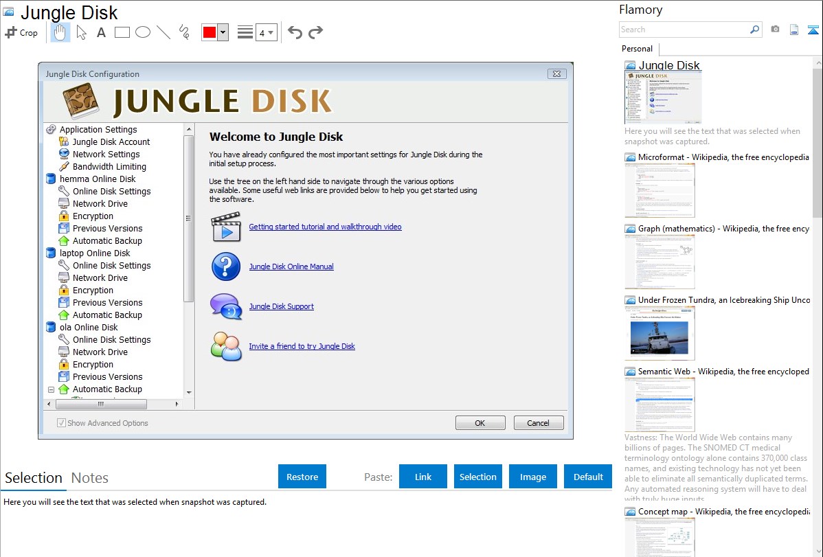 Flamory helps you capture and store screenshots from Jungle Disk by pressing a single hotkey. It will be saved to a history, so you can continue doing your tasks without interruptions. Later, you can edit the screenshot: crop, resize, add labels and highlights. After that, you can paste the screenshot into any other document or e-mail message.