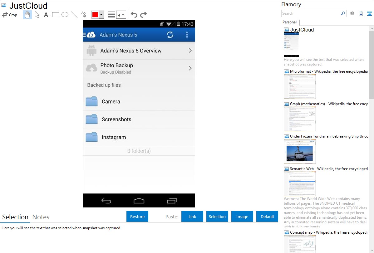 Flamory helps you capture and store screenshots from JustCloud by pressing a single hotkey. It will be saved to a history, so you can continue doing your tasks without interruptions. Later, you can edit the screenshot: crop, resize, add labels and highlights. After that, you can paste the screenshot into any other document or e-mail message.