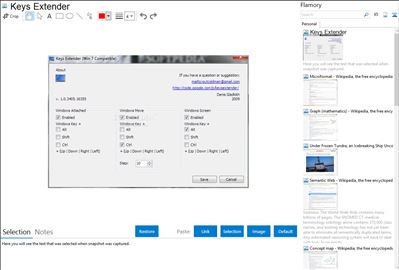 Flamory helps you capture and store screenshots from Keys Extender by pressing a single hotkey. It will be saved to a history, so you can continue doing your tasks without interruptions. Later, you can edit the screenshot: crop, resize, add labels and highlights. After that, you can paste the screenshot into any other document or e-mail message.