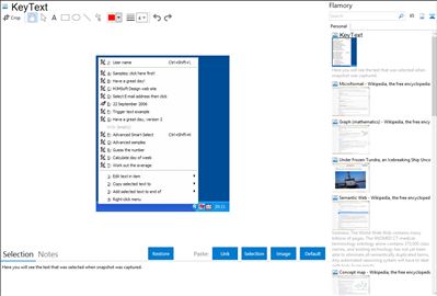 KeyText stores pieces of text, ready to be typed or pasted into any application by a simple hotkey press or menu selection. "Right-click anywhere" feature makes form-filling easier than ever. Include commands to run programs, click buttons, change windows, visit Internet sites and more - or automate mouse clicks which hit the right spot even if a window changes position. "Smart Select" feature lets you, for example, select an e-mail address in any app, hit a hotkey, and your e-mail program starts with a new message ready.