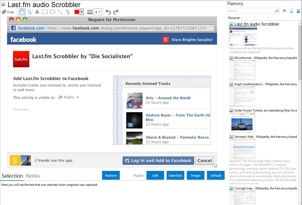 Flamory helps you capture and store screenshots from Last.fm audio Scrobbler by pressing a single hotkey. It will be saved to a history, so you can continue doing your tasks without interruptions. Later, you can edit the screenshot: crop, resize, add labels and highlights. After that, you can paste the screenshot into any other document or e-mail message.
