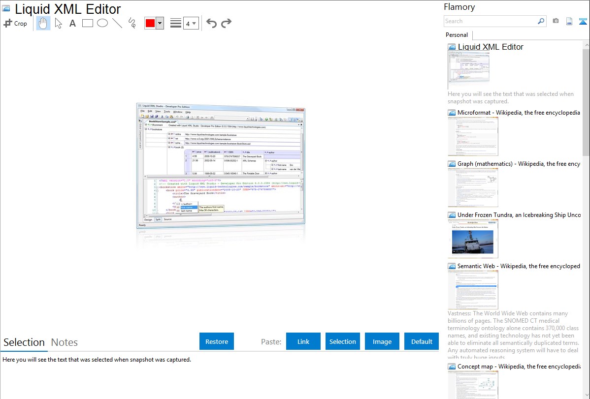 Flamory helps you capture and store screenshots from Liquid XML Editor by pressing a single hotkey. It will be saved to a history, so you can continue doing your tasks without interruptions. Later, you can edit the screenshot: crop, resize, add labels and highlights. After that, you can paste the screenshot into any other document or e-mail message.