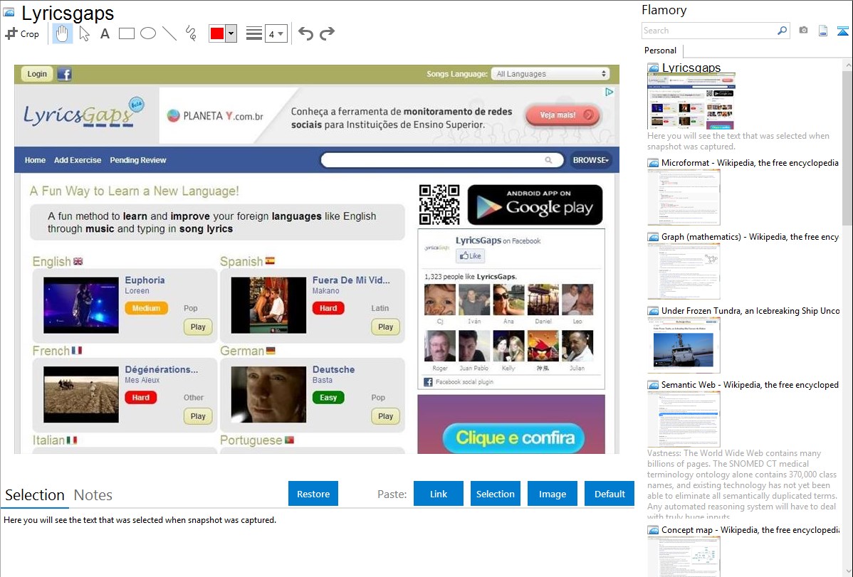 Flamory helps you capture and store screenshots from Lyricsgaps by pressing a single hotkey. It will be saved to a history, so you can continue doing your tasks without interruptions. Later, you can edit the screenshot: crop, resize, add labels and highlights. After that, you can paste the screenshot into any other document or e-mail message.