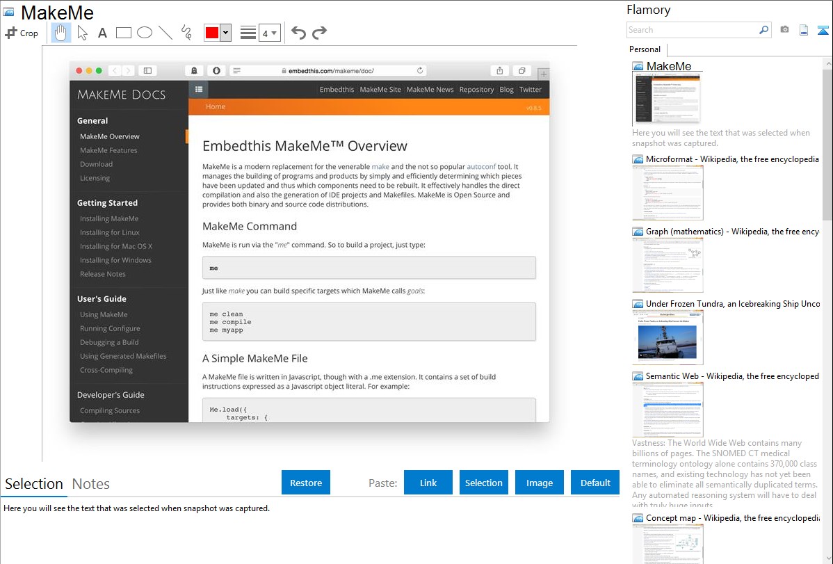 Flamory helps you capture and store screenshots from MakeMe by pressing a single hotkey. It will be saved to a history, so you can continue doing your tasks without interruptions. Later, you can edit the screenshot: crop, resize, add labels and highlights. After that, you can paste the screenshot into any other document or e-mail message.