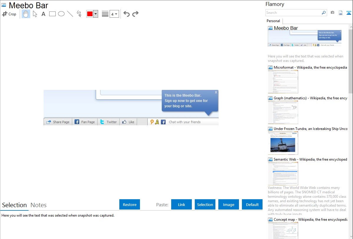 Flamory helps you capture and store screenshots from Meebo Bar by pressing a single hotkey. It will be saved to a history, so you can continue doing your tasks without interruptions. Later, you can edit the screenshot: crop, resize, add labels and highlights. After that, you can paste the screenshot into any other document or e-mail message.