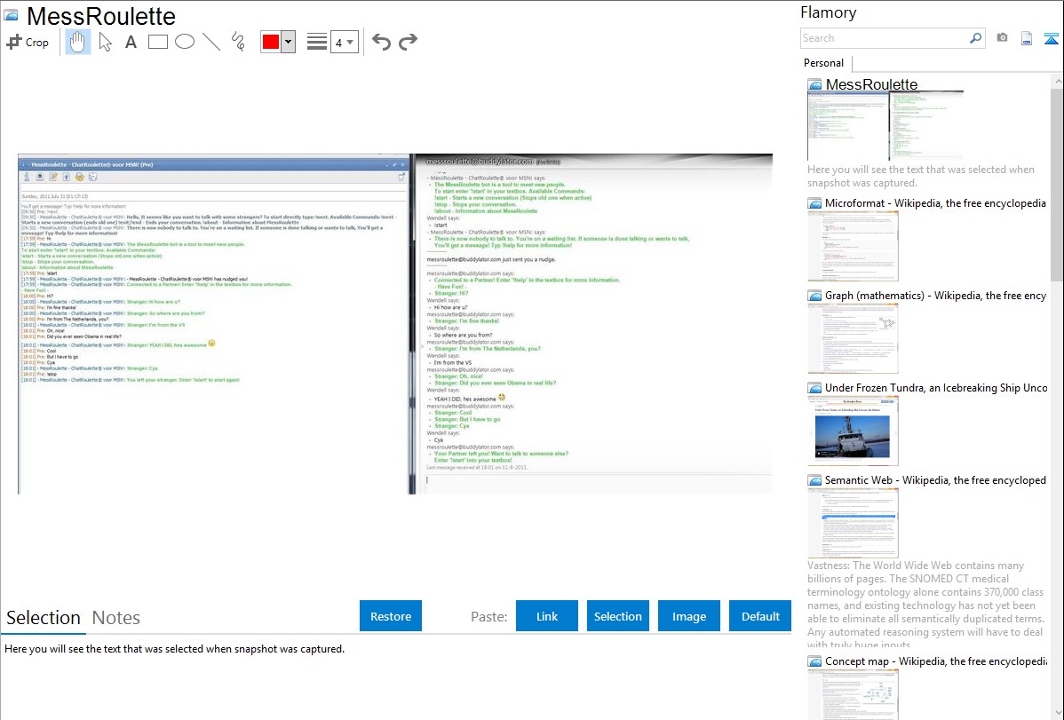 Flamory helps you capture and store screenshots from MessRoulette by pressing a single hotkey. It will be saved to a history, so you can continue doing your tasks without interruptions. Later, you can edit the screenshot: crop, resize, add labels and highlights. After that, you can paste the screenshot into any other document or e-mail message.