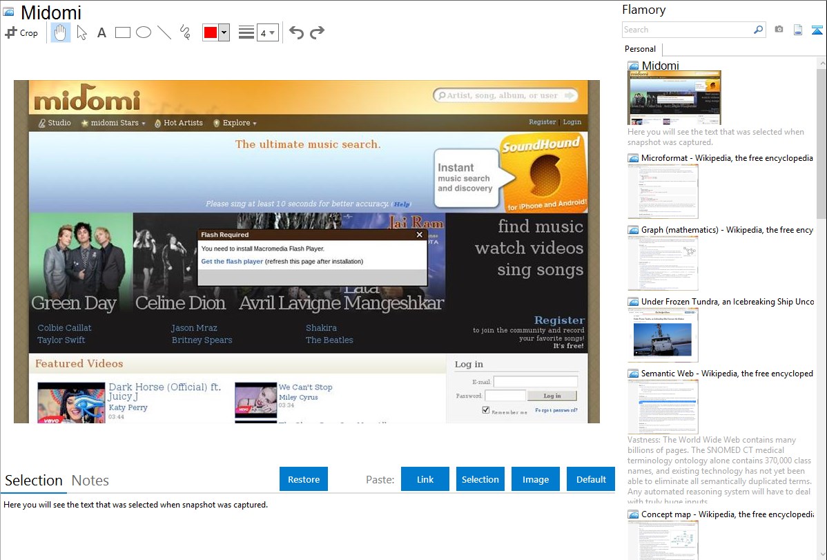 Flamory helps you capture and store screenshots from Midomi by pressing a single hotkey. It will be saved to a history, so you can continue doing your tasks without interruptions. Later, you can edit the screenshot: crop, resize, add labels and highlights. After that, you can paste the screenshot into any other document or e-mail message.